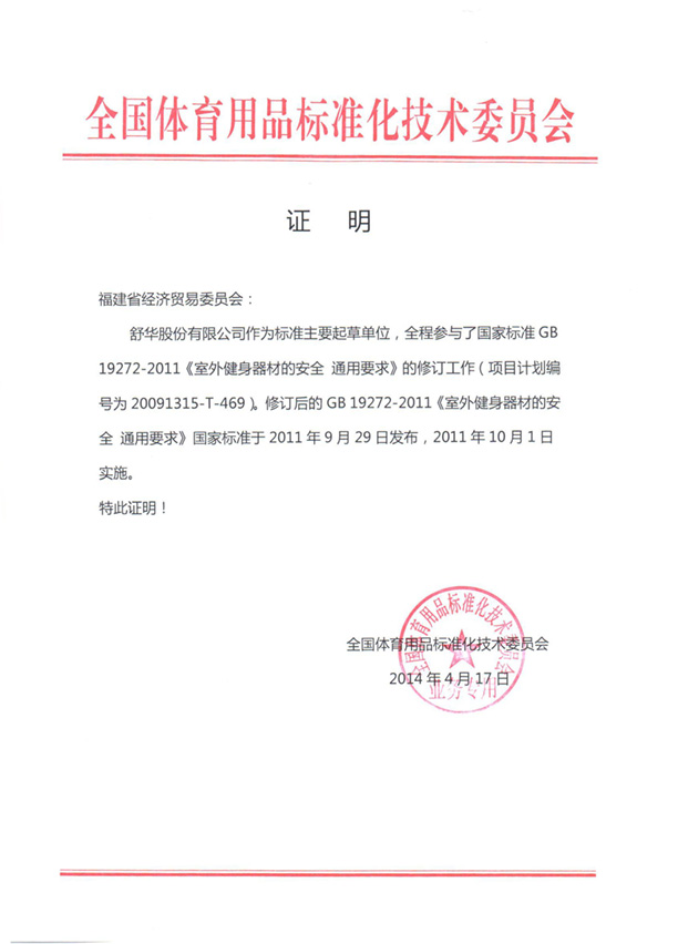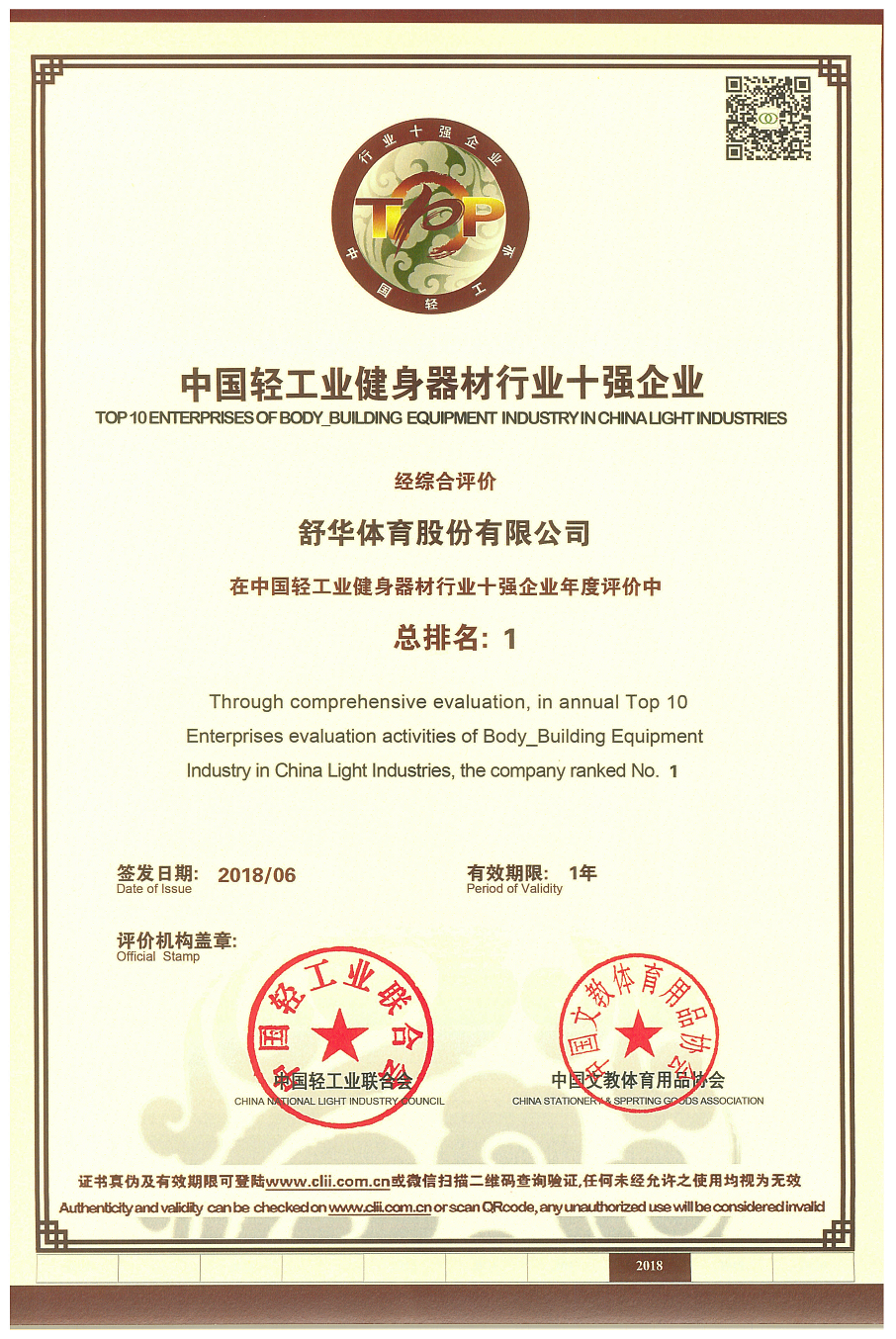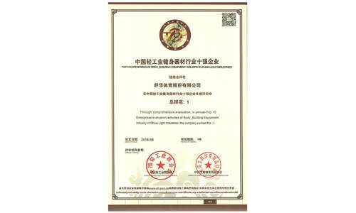 From 2017 to 2018, Shuhua was named the "Top 10 Enterprise of Body Building Equipment Industry in China Light Industries " for the second consecutive year. In 20